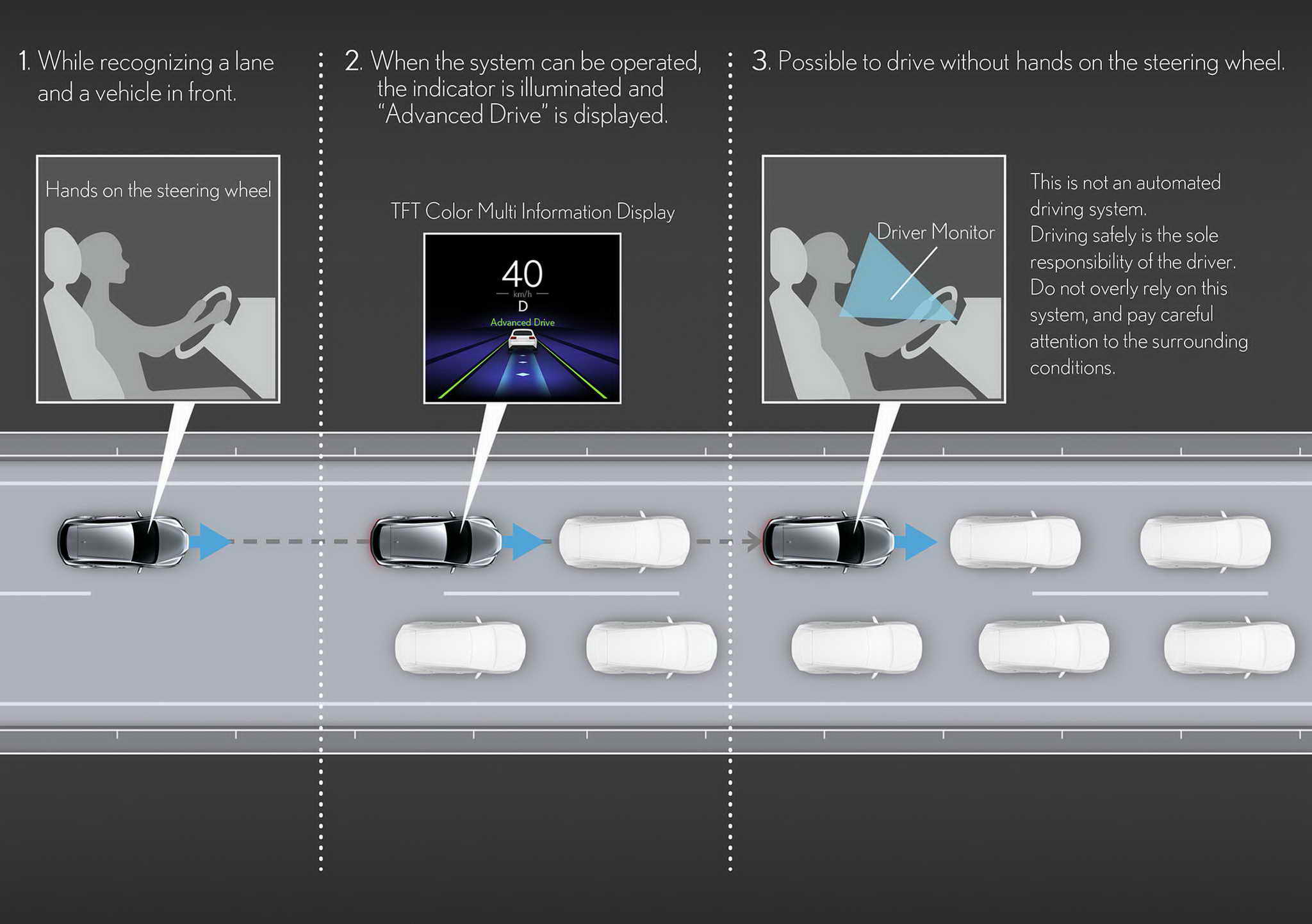 *6 A Toyota egyedi autonóm vezetési filozófiáján, a „Mobility Teammate Concept”-en alapul, amely az embereket és az autókat megbízható partnerekként képzeli el, akik együtt fejlődnek és eggyé válnak. A Lexus Teammate a Toyota Motor Corporation védjegye. Az Advanced Drive (forgalmi dugók támogatása) nem egy teljesen autonóm vezetési rendszer. Mindig figyeljen a környezetére, és gondoskodjon a biztonságáról. Ne hagyatkozzon kizárólag a rendszerre.